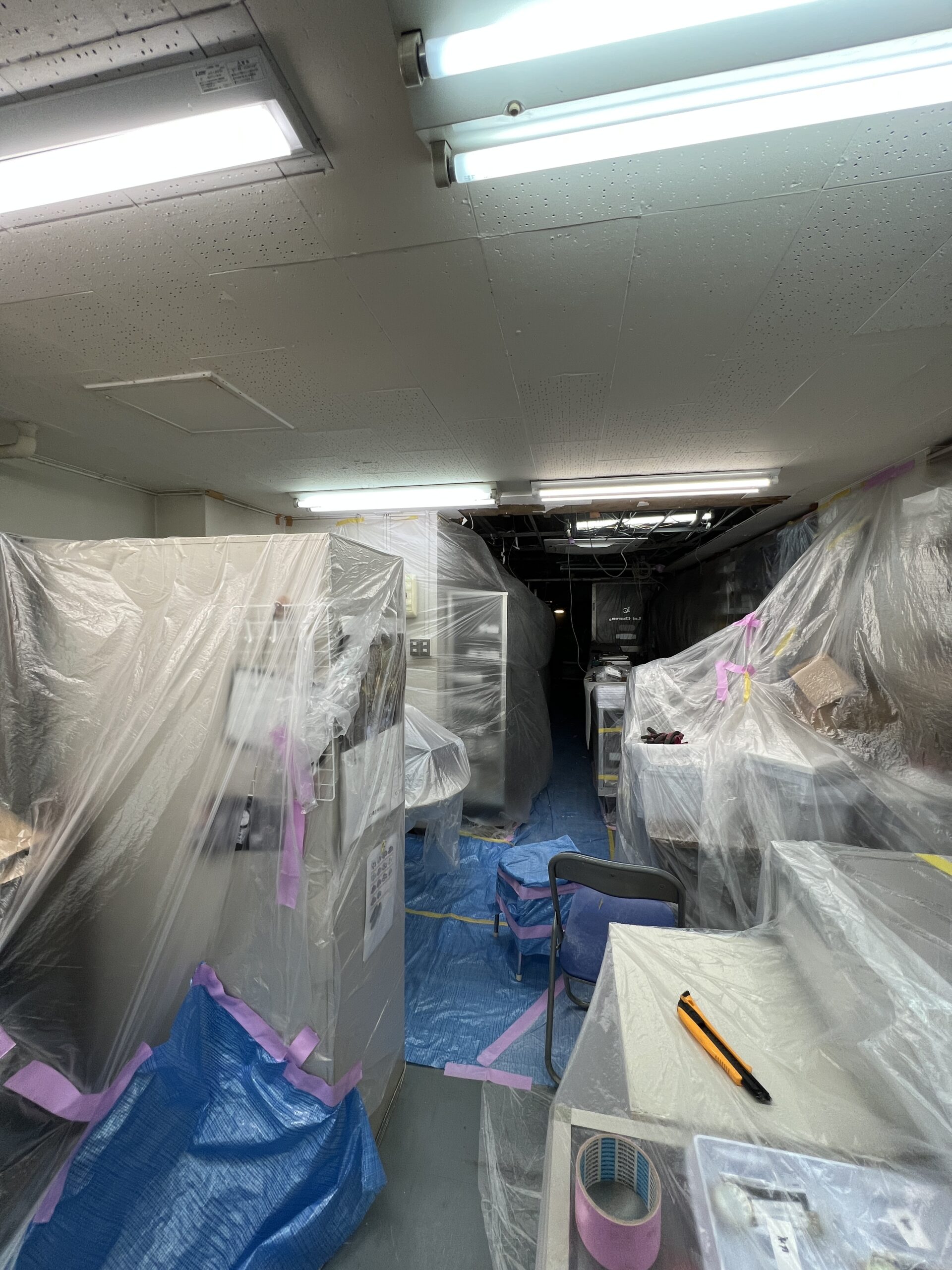 今回の現場は腕時計などの精密機器を扱う製造事務所であり、設備や環境への配慮が非常に重要でした。特に印象的だったのは、家財や機材の一部が移動できない状態だった点です。そのため、解体作業と並行して徹底した養生作業が求められました。振動や粉塵が少しでも影響しないよう、細部まで気を配りながら作業を進める必要があり、通常以上に手間と時間を要しました。